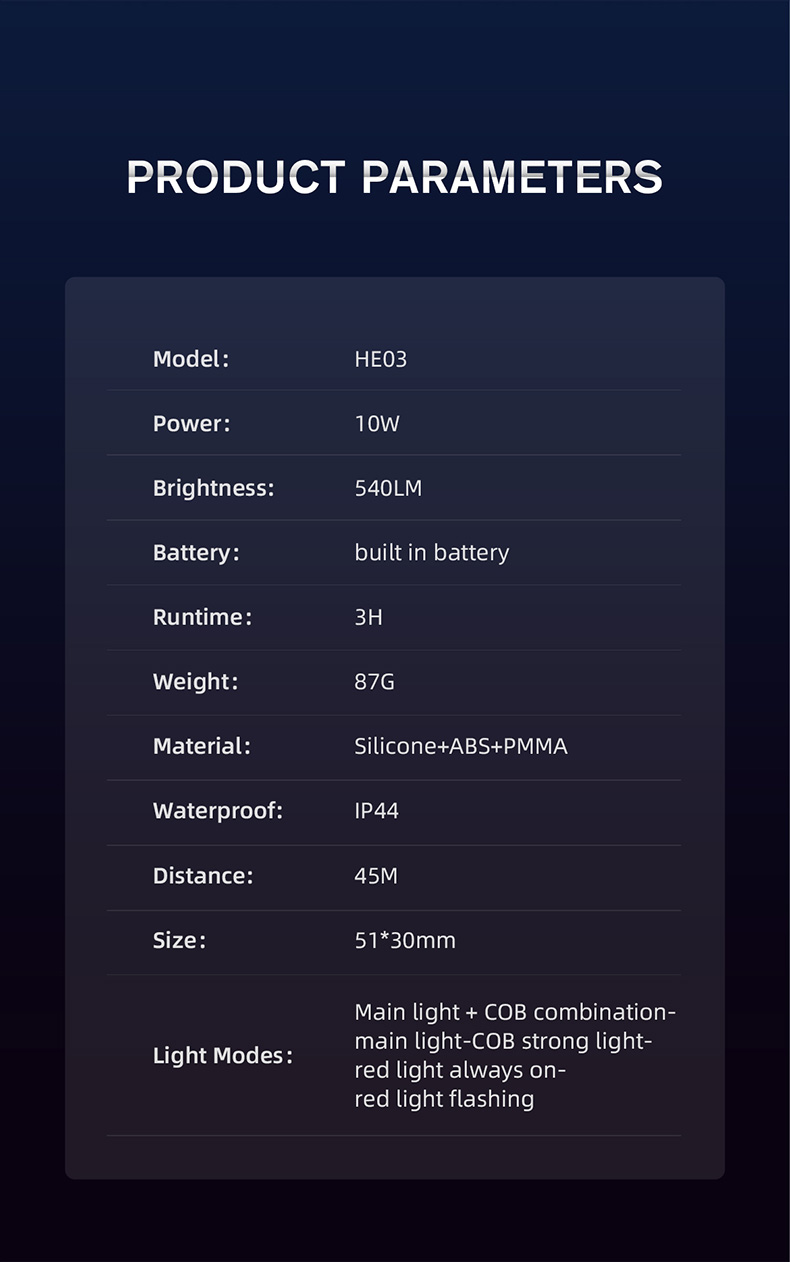 He03 là đèn pha cảm ứng đa chức năng với công suất 10W và độ sáng 540lm. Nó có các tính năng như cảm biến sóng tay thông minh với khoảng cách cảm biến vàng 10cm, sạc nhanh TYPE-C và không thấm nước cho cuộc sống hàng ngày. Với trọng lượng 87g, sản phẩm rất nhẹ. Nó phù hợp cho người dùng cần ánh sáng cho các hoạt động ngoài trời như khám phá và sử dụng tại nhà. Nó có thiết kế công tắc kép và điều chỉnh 5 tốc độ.
