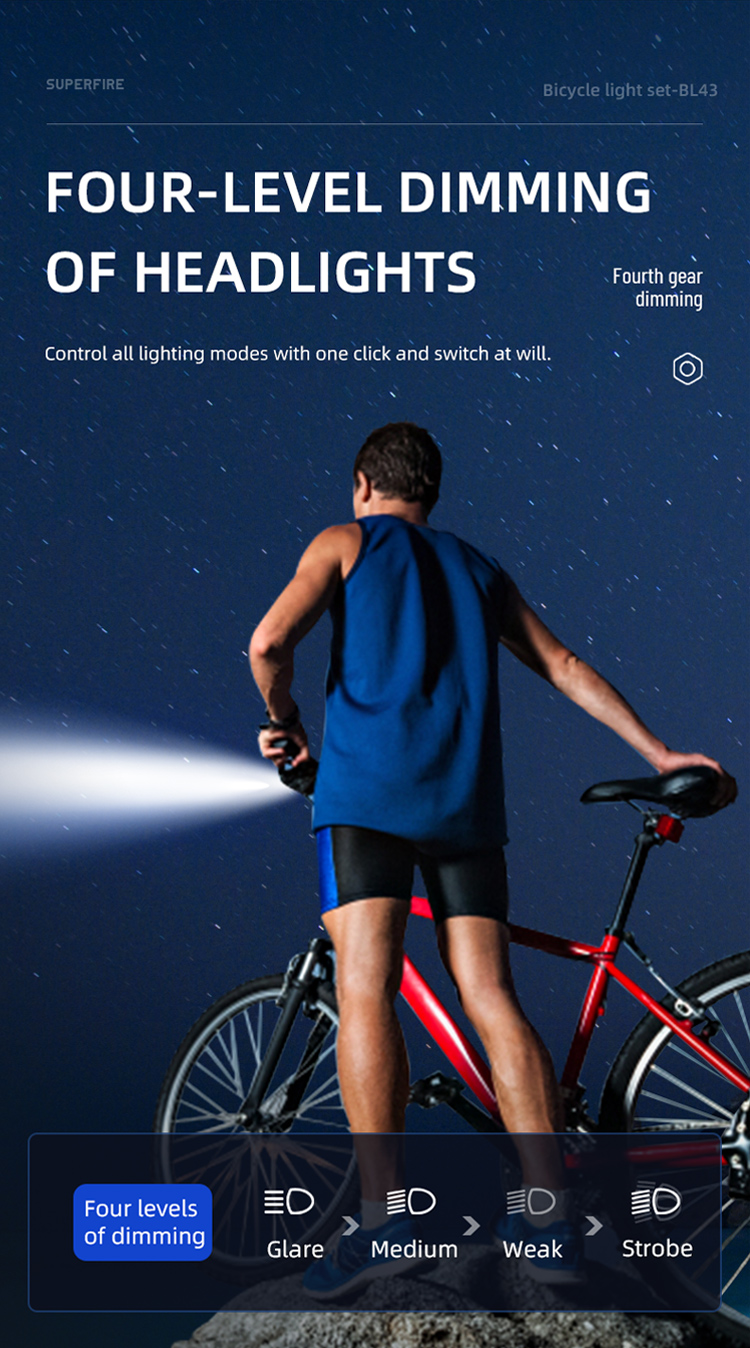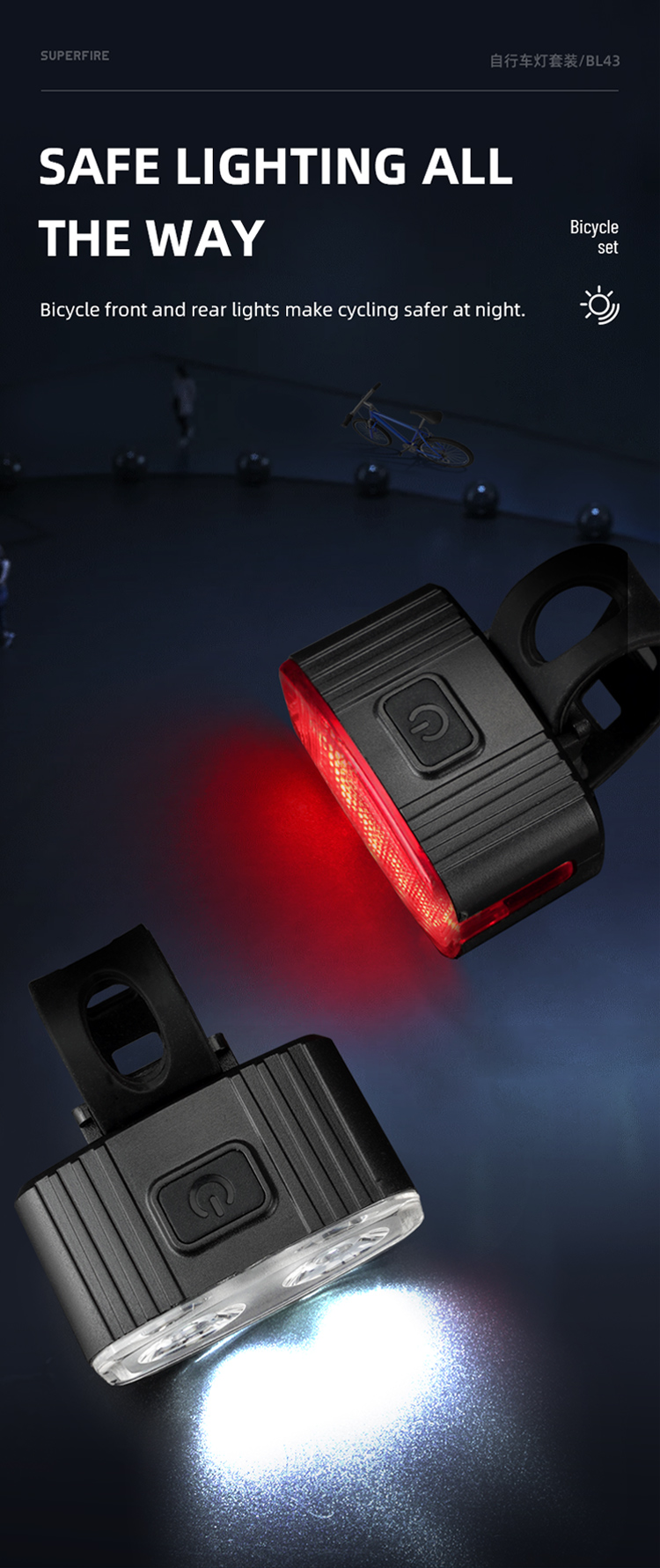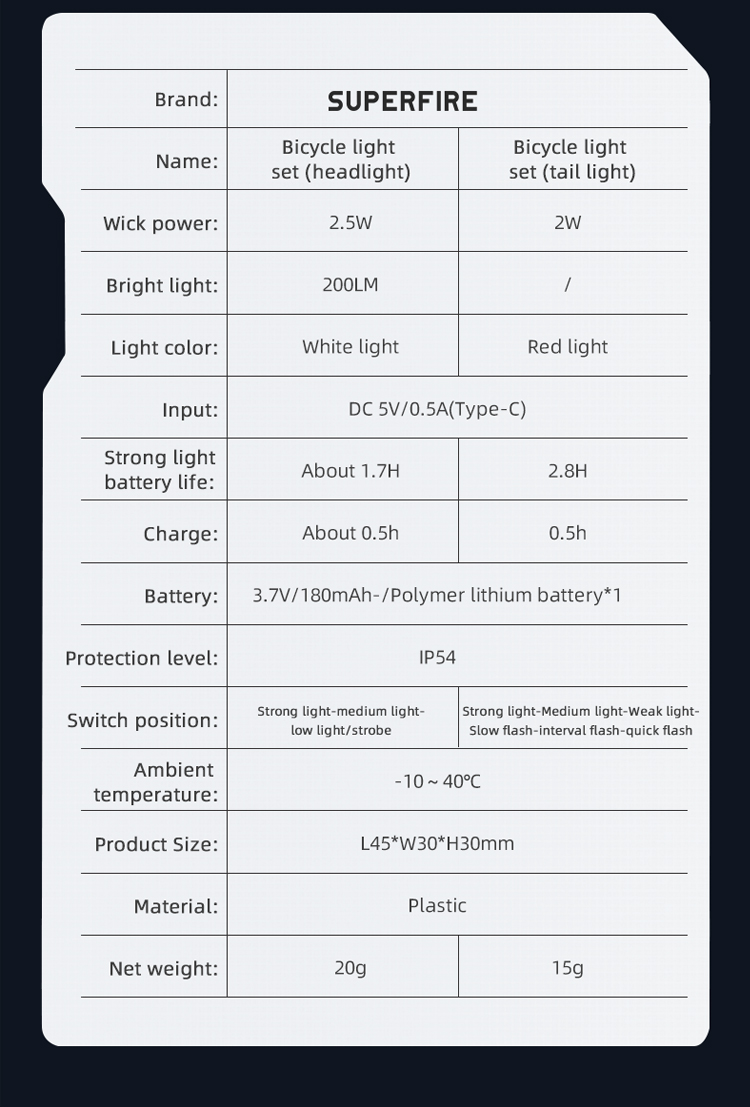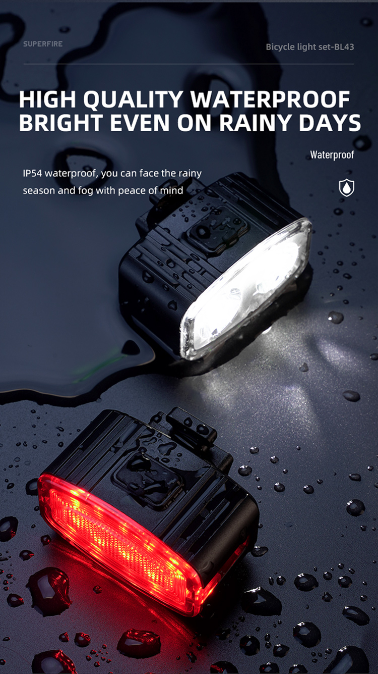 Giới thiệu đèn trước và đèn đuôi xe đạp superfire Led sạc được BL43 Series: Đèn xe đạp nhỏ gọn, có thể sạc lại được thiết kế để đảm bảo an toàn và tầm nhìn khi đi xe. Đèn đỏ cảnh báo xe phía Sau cung cấp Sáu chế độ: cao, trung bình, thấp, đèn flash chậm, đèn flash xen kẽ và đèn flash nhanh, đèn trắng phía trước cung cấp 4 chế độ chiếu sáng: cao, Trung bình, thấp, nhấp nháy. IP54 không thấm nước, bạn có thể đi xe an toàn ngay cả trong những đêm mưa. Lắp đặt dễ dàng, phù hợp với mọi loại xe đạp. Lý tưởng cho người đi làm hoặc người đi xe đạp giải trí tìm kiếm ánh sáng và tầm nhìn đáng tin cậy vào ban đêm hoặc trong điều kiện ánh sáng yếu. Bộ đèn này được thiết kế để cung cấp cho người đi xe đạp sự cân bằng về hiệu suất, tính di động và khả năng chi trả.