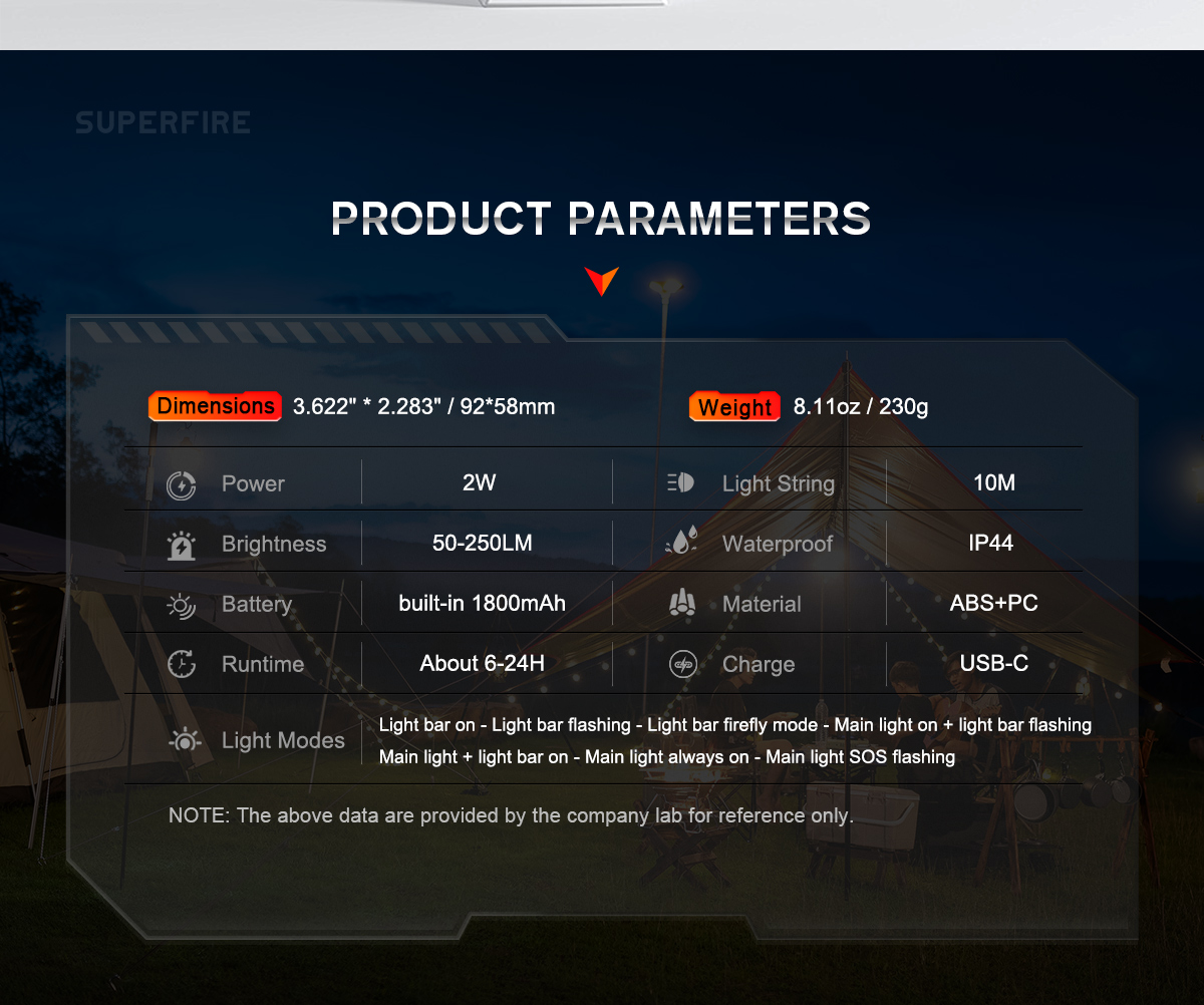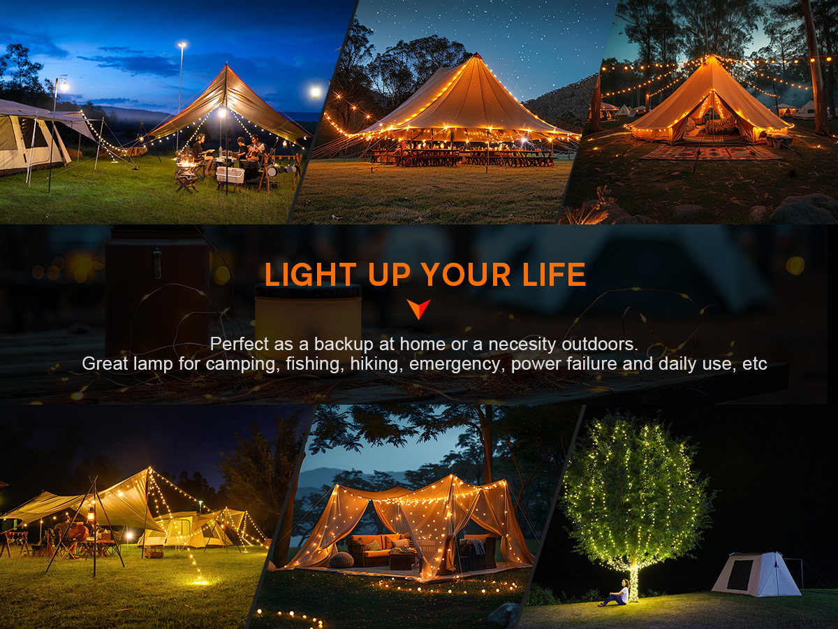 Giới thiệu Đèn dây cắm trại 2 trong 1 superfire LT01. Với 7 chế độ ánh sáng có thể tùy chỉnh, Đèn dây này có thể dễ dàng thích ứng với nhiều tình huống ngoài trời, cho dù bạn đang cắm trại, thưởng thức bữa tiệc ở sân sau hoặc tạo không khí lễ hội. Chiều dài 32.8 feet đảm bảo vùng phủ sóng rộng, chiếu sáng hoàn hảo các khu vực rộng lớn như lều, tán cây hoặc xung quanh khu cắm trại, Mang đến bầu không khí tiện dụng và thoải mái cho không gian ngoài trời của bạn. Cấu trúc nhẹ và nhỏ gọn giúp bạn dễ dàng đóng gói và cất trong dụng cụ cắm trại của mình, và được trang bị một cái móc tiện lợi, bạn có thể dễ dàng đặt đèn dây bên trong lều, trên cành cây, hoặc bất kỳ vị trí thích hợp nào để chiếu sáng tối ưu. Hoàn hảo cho các môi trường ngoài trời như đi cắm trại, tiệc ở sân sau hoặc trang trí ngày lễ, superfire LT01 kết hợp thiết kế sáng tạo với hiệu suất đáng tin cậy để đảm bảo rằng bạn có đủ ánh sáng và chuẩn bị bất kể dịp nào. Làm cho mọi khoảnh khắc trở nên tươi sáng hơn với superfire LT01!